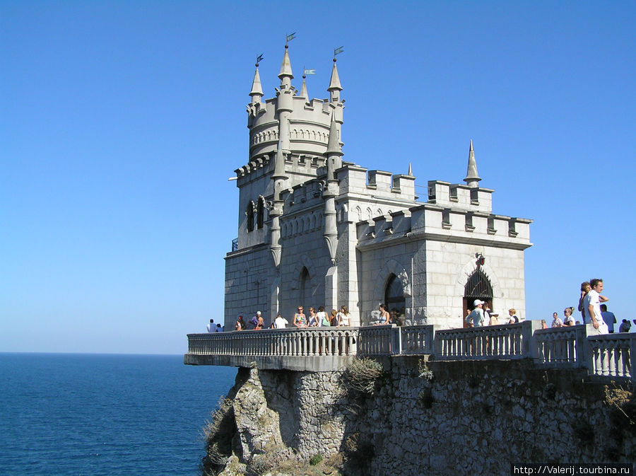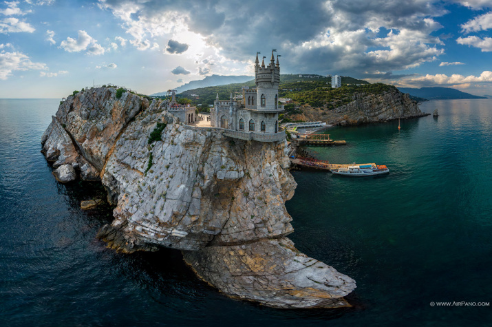 Еще одна замечательная достопримечательность и съемочная площадка — Ласточкино гнездо, готический символ Крыма. Этот квази-средневековый замок, построенный в 1912 году, стоит на месте древнего храма, прильнув к крутой скале, как ласточкино гнездо. Бывший владелец имения называл его «Замком любви». Размеры Ласточкино гнездо на самом деле крошечные, кошку нельзя раскачать в постройке шириной 10 м, длиной 20 м и высотой 12 м. Во время сильного землетрясения в 1927 году часть поддерживающей породы рухнула в море.Замок почти не пострадал, если не считать острых шпилей и обломка камня из-под нижнего балкона, упавшего в море. Место стоит посетить.