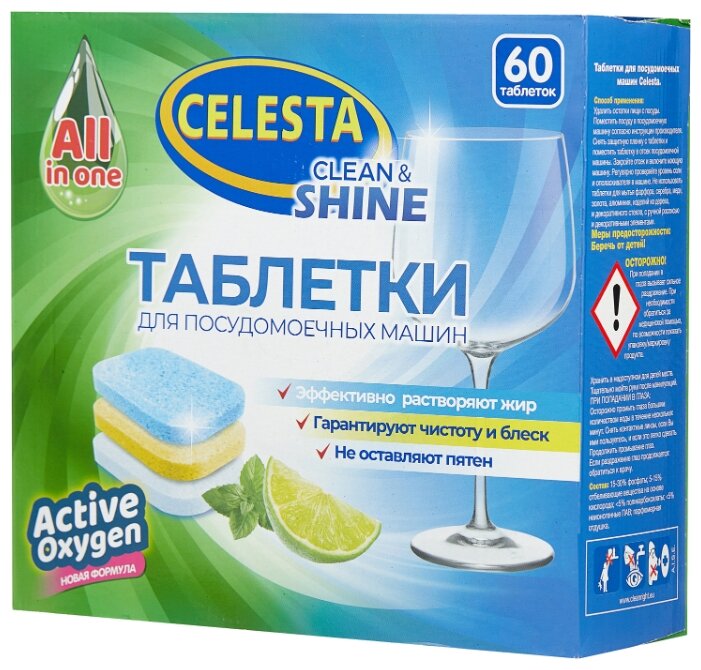 В состав входит соль для смягчения используемой воды и предотвращения образования накипи, ополаскиватели для защиты поверхности посуды, в частности бокалов и хрусталя.
