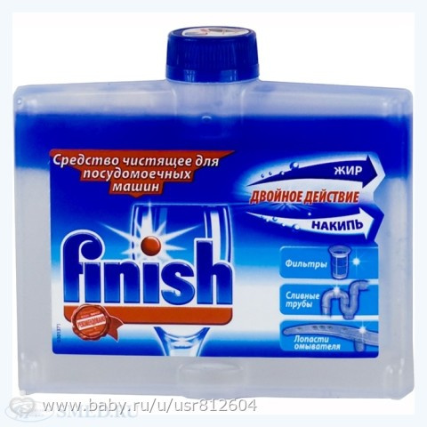 С нашей стороны мы порекомендуем применять очиститель для посудомоечных машин Finish. Флакончика 250 мл.хватает на два применения. Он очищает все вплоть до накипи, которая уже успела скопиться внутри.