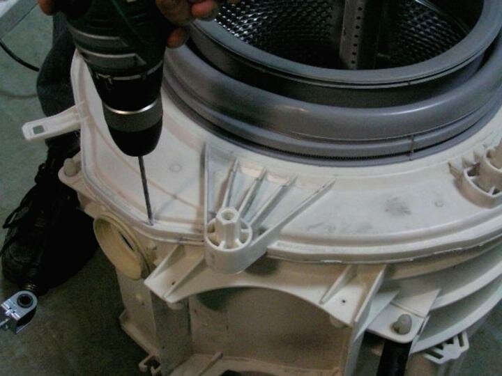 Бывает и так, что во время стирки между барабаном и баком попадает какой-то предмет. В этом случае последний может треснуть. Придётся менять деталь или покупать новый агрегат. И то, и другое обойдётся недёшево.