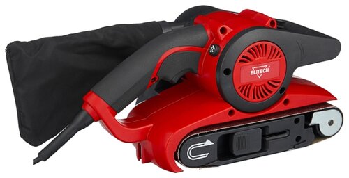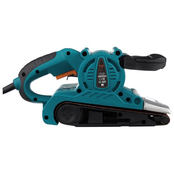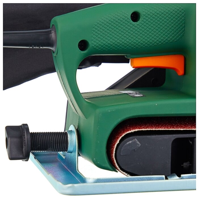 Особенности конструкции. В шлифовальный механизм заправляется абразивная лента 75х533 мм с использованием рычажного устройства для оптимального натяжения. Ее положение регулируется вручную без применения дополнительных ключей с помощью встроенного в конструкцию винта с широкой рукояткой. Сбоку крепится контейнер для сбора опилок, вместо которого можно подключить шланг от пылесоса.