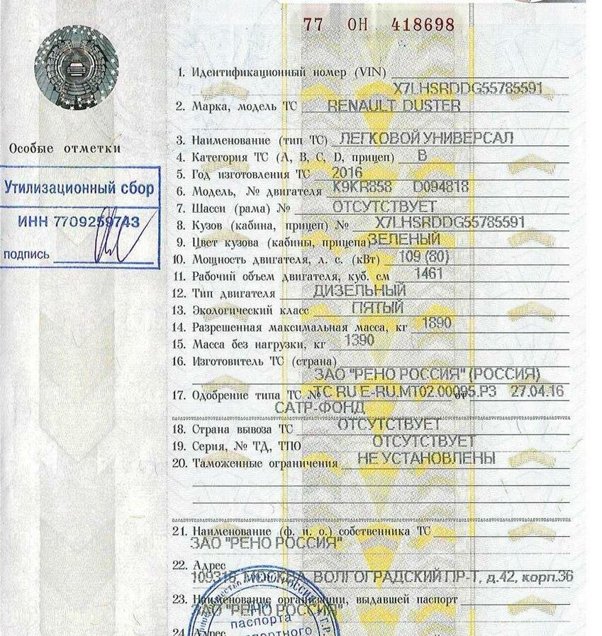 — данные в сертификате соответствия требованиям техрегламента «О требованиях к выбросам автомобильной техникой, выпускаемой в обращение на территории Российской Федерации, вредных (загрязняющих) веществ», который выдается на конкретное транспортное средство (обязательно полное совпадение VIN кузова ТС с VIN-ом, указанным в сертификате). Выдаются такие сертификаты только сертификационными центрами, аккредитованными Федеральным агентством по техническому регулированию и метрологии РФ.