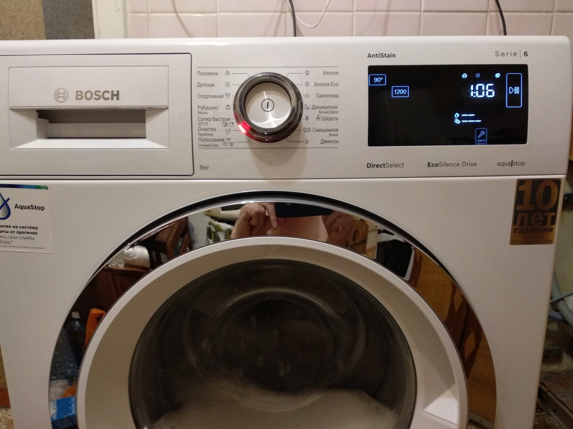 LED-дисплей обеспечивает комфортное управление процессом стирки. Машина имеет функцию очистки поверхности барабана, опцию защиты от детей. Автомат полностью защищен от аварийных протечек, также интеллект следит за уровнем образованной пены.