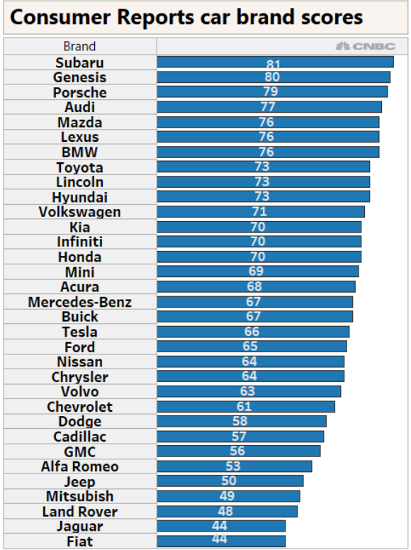 Немецкие производители показали худшие результаты, Mercedes-Benz занял 14-е место в таблице. BMW заняла худшее место, уступив Fiat, и Audi также оказалась в тройке последних. Возможно, это могло быть связано с недавним притоком предложений по финансированию автомобилей премиум-класса, что сделало их более доступными для населения.