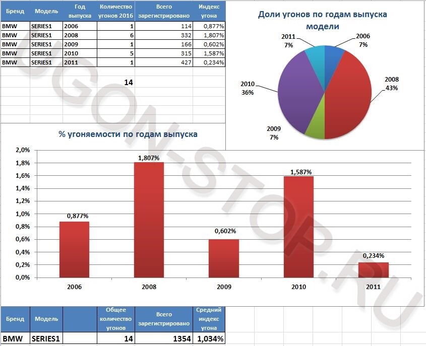 Специалисты организации составили рейтинг самых популярных у угонщиков моделей, посчитав количеству угонов каждой модели на тысячу единиц. Этот рейтинг показывает неоднозначность мнения о том, что наиболее продаваемые машины угоняют чаще. Например, популярный в России седан Hyundai Solaris с рейтингом 2,2 находится на 28 месте, а соплатформенный Kia Rio — на 55-м (1,6).