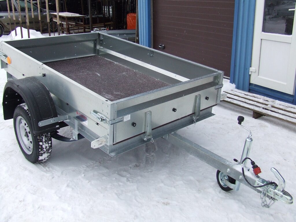 Конструкция выполнена из оцинкованного стального листа с применением лазерной технологии раскроя. Возможности прицепа могут быть расширены благодаря установке дополнительных бортиков, тента, переднего опорного колеса.