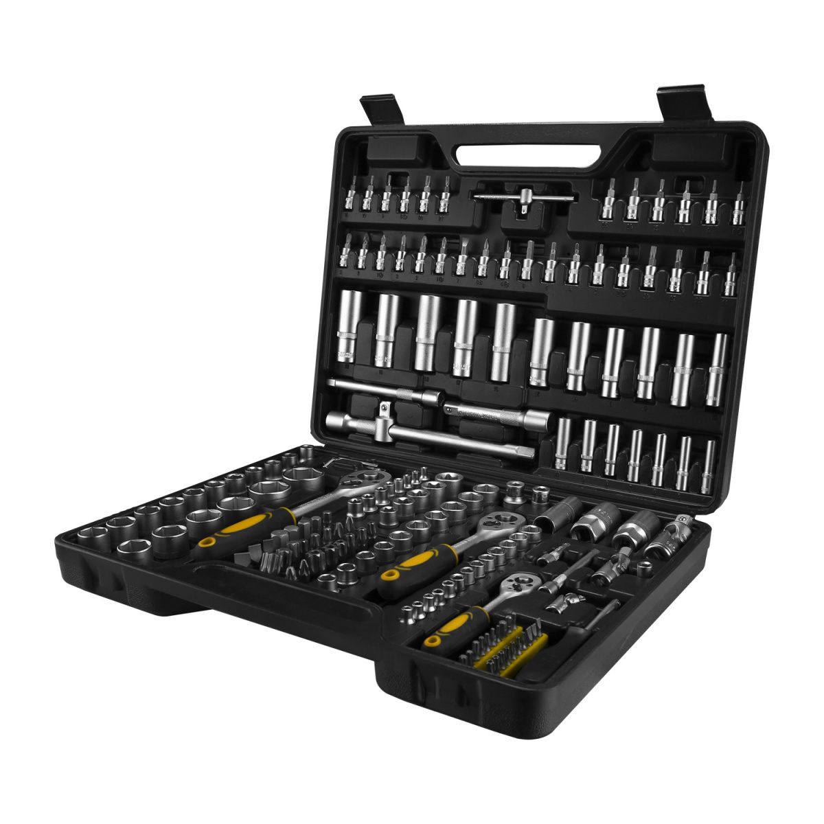 Впечатляющий комплект, состоящий из 239 деталей из легированной стали, покрытых гладким хромом.В комплект входят стандартные и глубокие головки SAE и метрические, а также быстросъемные трещотки с 45 зубьями, комбинированные ключи и головки с 12-гранной головкой, а также 22 SAE и метрические шестигранные ключи с длинными рукавами. Вы также получите девять бит, включая Torx, Phillips и насадки со шлицами. Все это поставляется в прочной коробке с тремя ящиками, металлическими петлями и эргономичной ручкой для переноски, поэтому все остается организованным, независимо от того, путешествуете ли вы с ним или держите его на скамейке для инструментов. В этом раунде обновлений мы прощаемся с Apollo Tools SAE, который является весьма доступным выбором, но, как правило, не имеет общего качества, а его компоненты не остаются надежно внутри слотов контейнера.