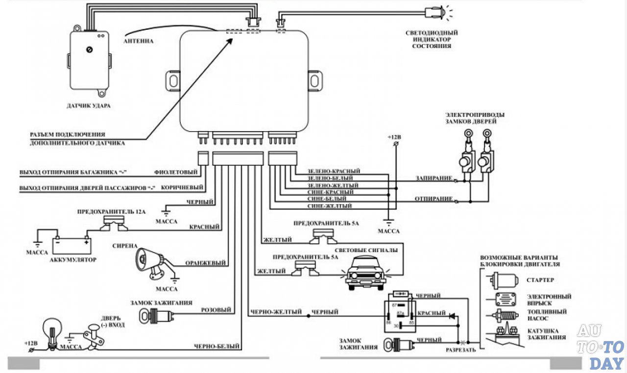 Схема является главным руководством к действию. - Если автосигнализация сделана собственными руками, при её подключении важно понимать, куда и какие провода надо подсоединять.