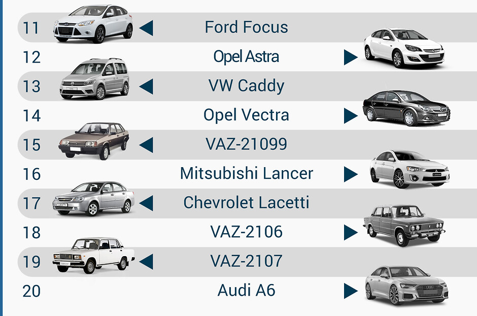 Подавляющее большинство машин в этом списке составили автомобили американских брендов: семь моделей компании Chrysler (Chrysler Town & Country, Chrysler PT Cruiser, Dodge Caravan и Grand Caravan, Dodge Journey, Dodge 2500 и Jeep Wrangler в четырехдверном исполнении), четыре модели General Motors (Chevrolet Uplander, GMC Acadia, Saturn Outlook и Saturn Relay), а также две модели Ford (Ford Explorer V6 и Ford F-250 Diesel).