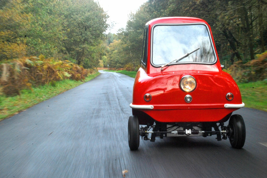 Это порождение сумрачного чайного гения было создано фирмой Peel Engineering Company в 1963 году. Автомобиль вмещал ОДНОГО взрослого человека, имел ОДНУ боковую дверь, ОДНУ фару и по габаритам как раз примерно соответствовал четвертинке нормального автомобиля. Каталась эта обувная коробка на трех крошечных колёсиках по схеме обратного треугольника. Багажник, какой багажник?
