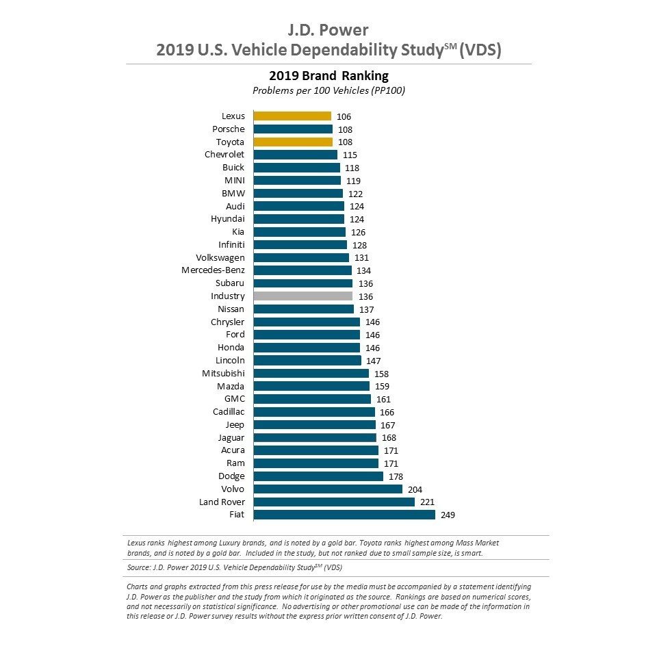 Для всех моделей из топ-50 21% владельцев сообщили о неисправности, причем наиболее распространенной проблемой являются электрические гремлины, не связанные с двигателем, за которыми следуют двигатель, его электрические системы и кузов автомобиля. В 68% случаев стоимость ремонта покрывалась по гарантии, при этом 36% всех автомобилей находились в эксплуатации и ремонтировались за день или меньше.